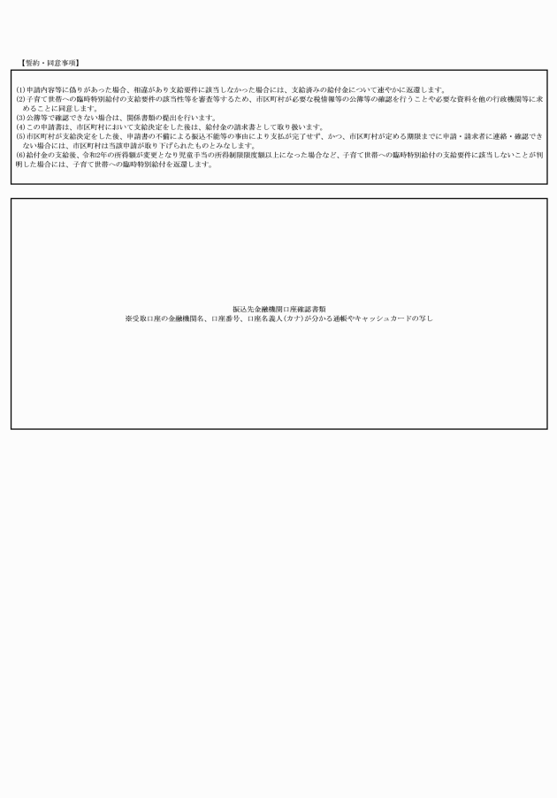第7条 新生児支給対象者は、新生児出生時に行つた児童手当の認定請求又は額改定請求と併せて令和3年度子育て世帯へ臨時特別給付申請書(別記第4号様式)(以下「別記第4号様式」という。)により子育て特別給付金の申請を行つた者については、児童手当振込指定口座に本給付金を振り込むこととする。児童手当の認定請求又は額改定請求をした後、別記第4号様式により別途本給付金について申請を行つた場合には、既に設定されている児童手当振込指定口座に振り込むことを原則としつつ、別記第4号様式に記載された振込指定口座に本給付金を振り込むこととする。(支給前までに指定口座の変更を届け出ている場合は、当該届出をした指定口座)